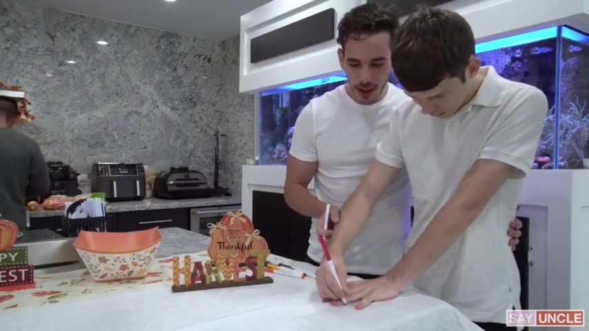 Сегодня день благодарения и в предвкушении праздника два молоденьких гея нескромно целуются и сосут прямо перед папашей. Этот зрелый ловелас не стал наказывать чуваков, а просто подсунул свой мощный член. В два ротика сынки отсосали и отдались в тугие попки, ведь толстый агрегат их качественно оттрахает прямо на столе и угостит горячим камшотом из спермы.