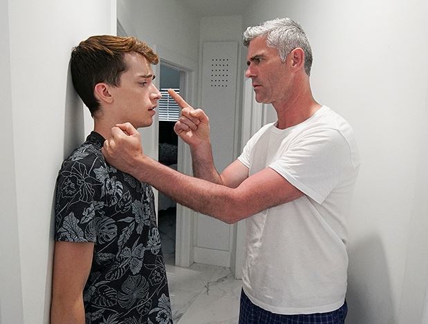 Молодой парниша ругнулся матом во время игры на приставке и это услышал его седовласый отчим. Мужик отчитал мальчугана за ругань, а ошалелый пацан разбил копилку бати прямо на его глазах. Такую наглость папочка прощать не стал и заставил наглого сыночка отсосать хуй, после чего потащил на диван и хорошенько отодрал его в жопу.