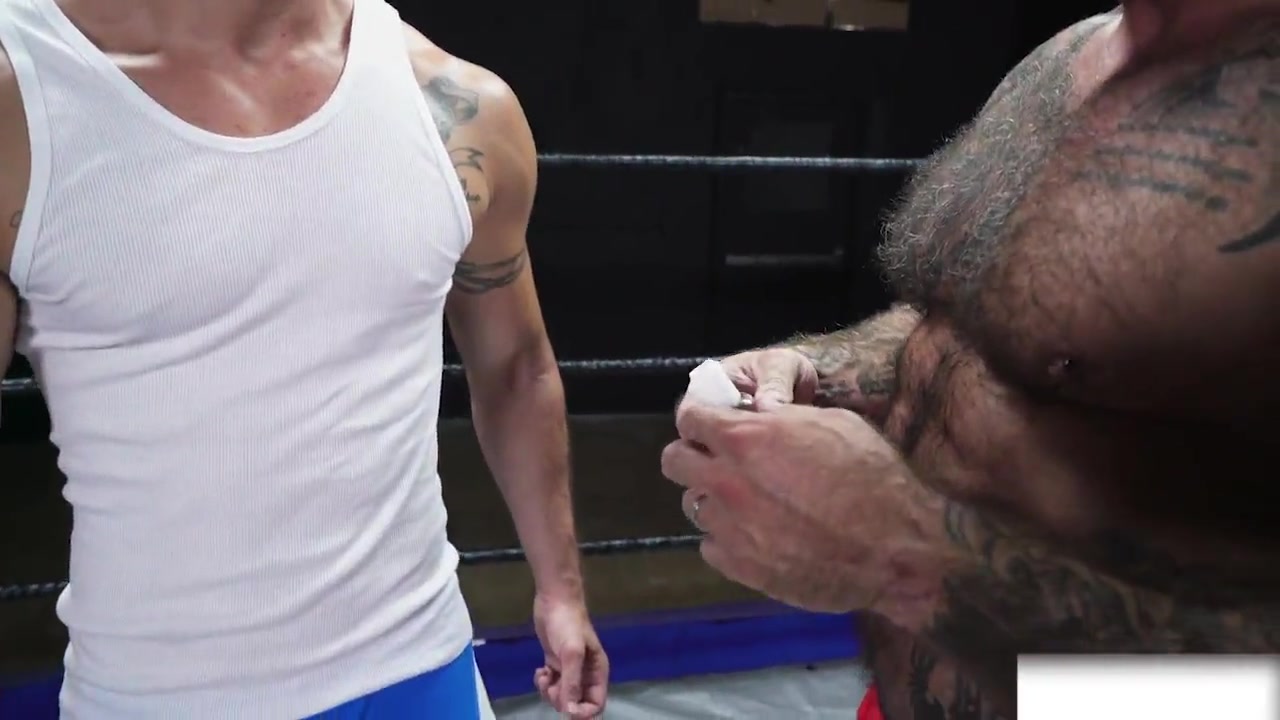 Брутальный тренер с татуировками на теле занимался борьбой с молодым парнем на ринге. Он зажал молодчика и возбудился от этого так сильно, что достал с трусов стоячий хуй и приказал пацану отсасывать орган, после чего взялся трахать паренька в анус. Чувак сопротивляться не стал и удовлетворил все желания жеребца.