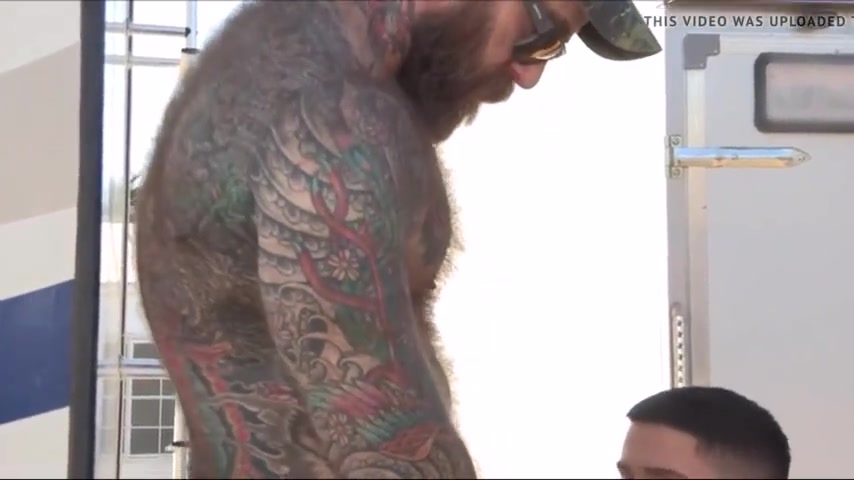 Татуированный брутал трахает сына в жопу у трейлера