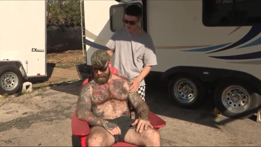 Татуированный брутал вместе со своим сыном и друзьями поехал на природу, чтобы там хорошо проводить время. Можно увидеть то, как здорово первый и второй занимаются сексом, и именно молодой человек хотел, чтобы папаша его сейчас отымел хорошенько в задницу. Раз он этого хочет, то обязательно получит, а нам предложат посмотреть на сей трах под открытым небом их друзья.