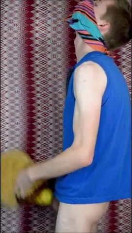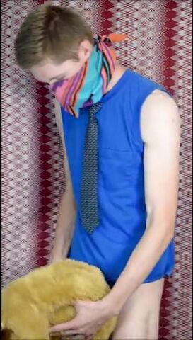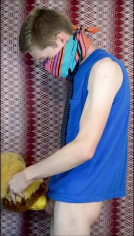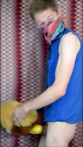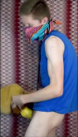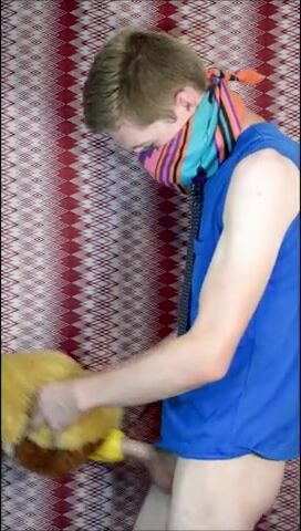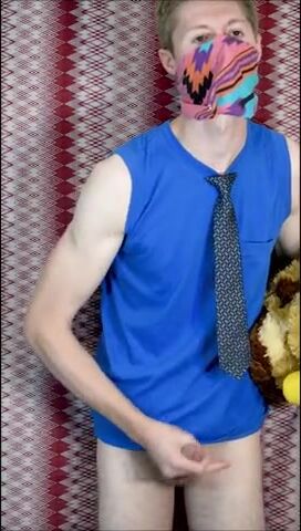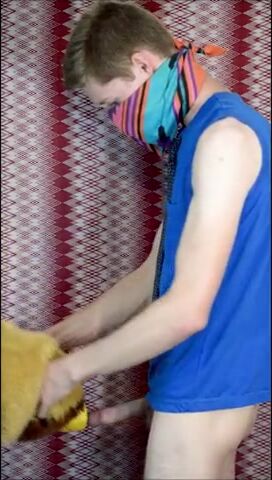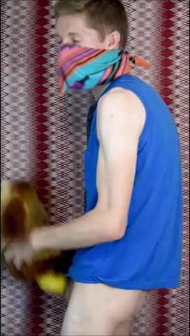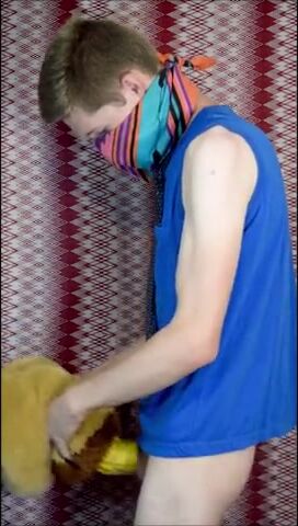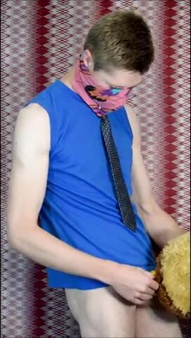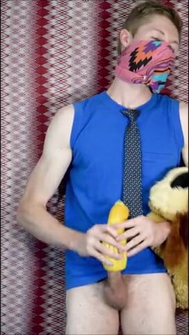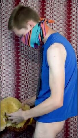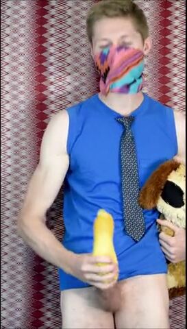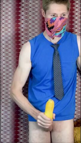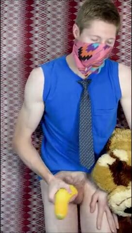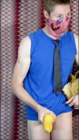 Пацан в рубахе с галстуком на всякий случай прикрыл лицо, потому что то, чем он будет заниматься, в обществе не приветствуется. Но анонимом можно творить абы какие вещи, как, например, наш герой сейчас ебет резиновую игрушку-кукурузку, используя ее вместо нормального заменителя вагины. А чтобы было прикольнее, он делает вид, что сношает мягую игрушку.